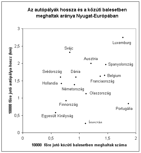 Nemrég a Levegő Munkacsoport szakértői egy érdekes összefüggést mutattak ki. Kiszámolták a 10 ezer lakosra jutó autópálya-hosszt és a 10 ezer főre jutó közúti balesetben elhunytak számát 15 nyugat-európai országban, és a két tényező összefüggését az alábbi ábrán tüntették fel. Az eredmény megdöbbentő: minél nagyobb egy országban az autópályák hossza, annál többen halnak meg a közutakon!