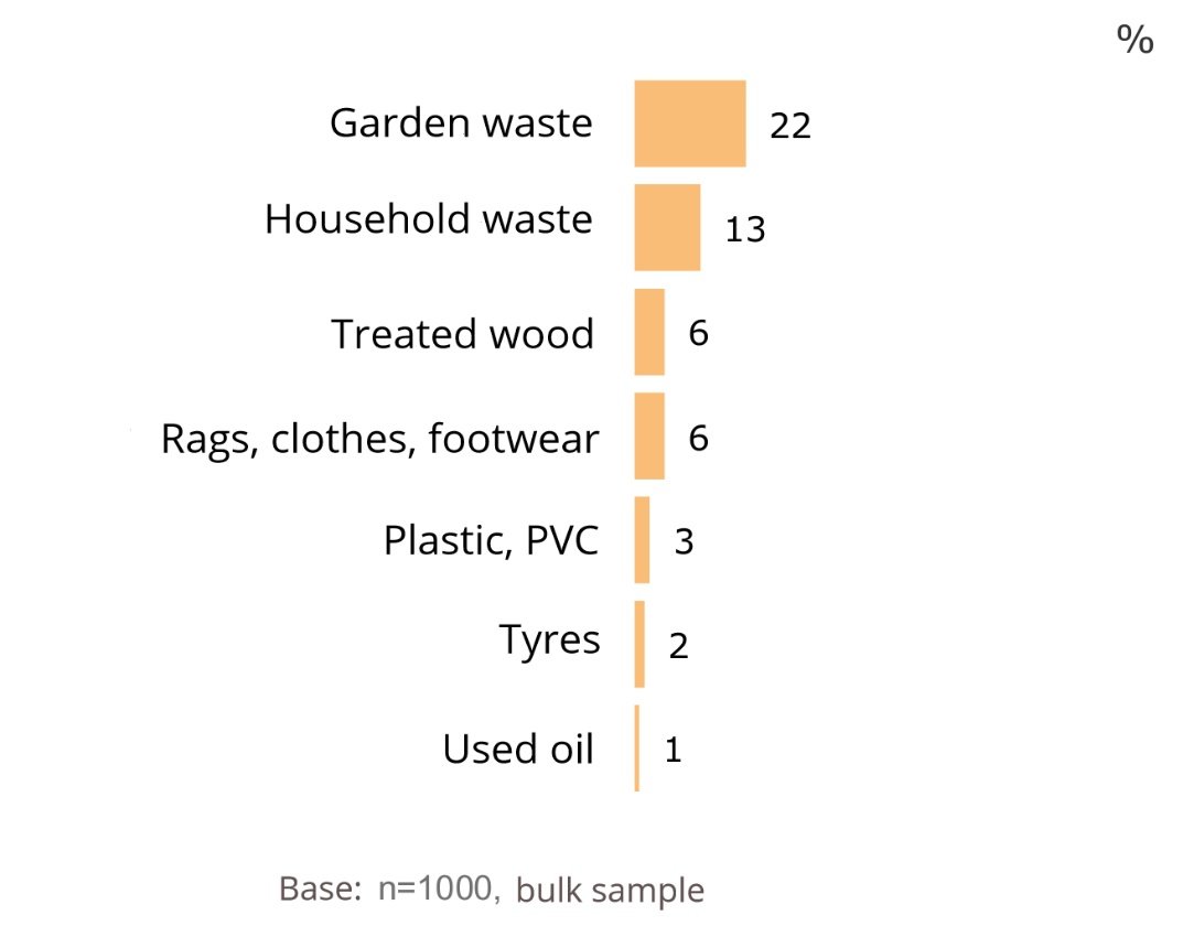 According to a national representative opinion poll − carried out by Kantar Hoffmann market research company for Clean Air Action Group and the Hungarian Anti-Poverty Network − one-third of the Hungarian population burns waste on a regular basis. Most people burn garden waste (22% of all respondents), household waste (13%), treated wood (6%), rags, clothes and footwear (6%). 3% burns plastics (in addition to household waste), and 1% burns tyres. Many of them burn in open space: household waste (10%), treated wood (4%), clothes and footwear (3%), plastic and tyre (2-2%).