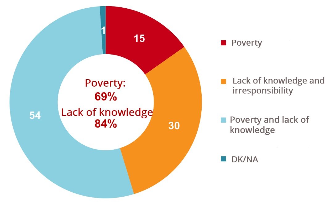 54% of the respondents consider the lack of knowledge, irresponsibility and poverty together as the main causes of illegal residential waste burning. 30% mostly blame the lack of knowledge and irresponsibility, while 15% trace back waste burning to poverty as the main cause.