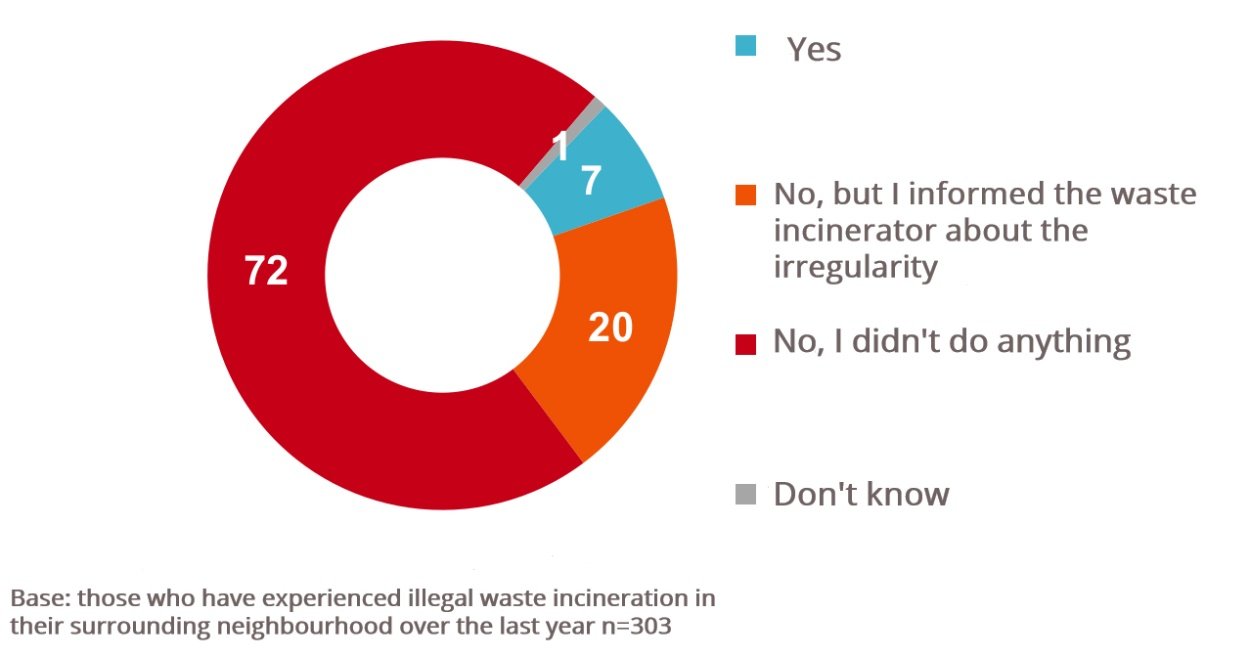 Very few people report to authorities when they experience illegal burning, only 7% of the respondents have ever reported. However, there were three times more people who informed the waste burners themselves of committing an illegal act. Those who notified the authorities also reported that in the vast majority of cases some kind of action was taken by the authorities, yet the burning did not cease.