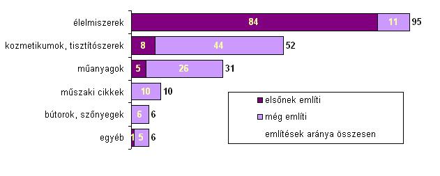 A megkérdezettek döntő többsége (84 százalék) továbbra úgy gondolja, hogy az élelmiszerekben található vegyi anyagok jelentik a legnagyobb kockázatot az ember egészségére, és összesen 95 százalék említette az élelmiszereket egészségre kockázatos termékként. A kozmetikumokat, tisztítószereket valamivel kevesebben nevezték meg, mint 2009-ben, de idén is a válaszadók több mint fele sorolta a kockázatos termékek közé, a legnagyobb arányban a 18-29 év közöttiek (65 százalék). A műanyagokat 31 százalék említette, a műszaki cikkekre ugyanakkor csak 10 százalék, a bútorokra, szőnyegekre pedig mindössze 6 százalék gondolt, pedig az elmúlt évek vérvizsgálatai során éppen a műszaki cikkekben, bútorokban is megtalálható anyagokat, műanyagadalékokat mutatták ki az emberek vérében. Az összes válaszadó 31, a nagycsaládosok 40 százaléka százalék hallott arról, hogy a polikarbonát alapanyagú cumisüvegek egy részében megtalálható biszfenol-A, már kis mennyiségben is kockázatos gyermekeink egészségére.