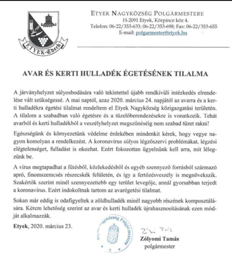 Sajnos ezekben az esetekben is a helyi rendelet az adott időszakban lehetővé teszi zöldhulladék égetését. Azonban úgy tűnik, egyes önkormányzatok kezdik felismerni a nyílt téri lakossági égetés okozta légszennyezés veszélyeit. Erre utal, hogy a civil szervezetek legutóbbi közleményével, valamint a Levegő Munkacsoport blogbejegyzésével összhangban Etyeken és Halásztelken azonnali hatállyal betiltották az avar és kerti hulladék égetését. Remélhetőleg egyre több önkormányzat követi példájukat, betiltják a zöldhulladékok égetését és határozottan fellépnek a helyi rendeletet megsértők ellen.
