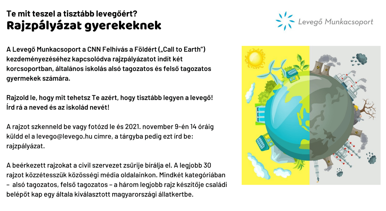 A Levegő Munkacsoport a CNN „Felhívás a Földért” („Call to Earth”) kezdeményezéséhez kapcsolódva rajzpályázatot indít általános iskolások számára. A gyerekek azt rajzolhatják le, hogy szerintük mit kellene tenni a tisztább, kevésbé szennyezett levegőért. A hírcsatorna a kezdeményezéssel környezetünk pusztításának súlyosságára és a megoldási lehetőségekre kívánja felhívni a figyelmet.
