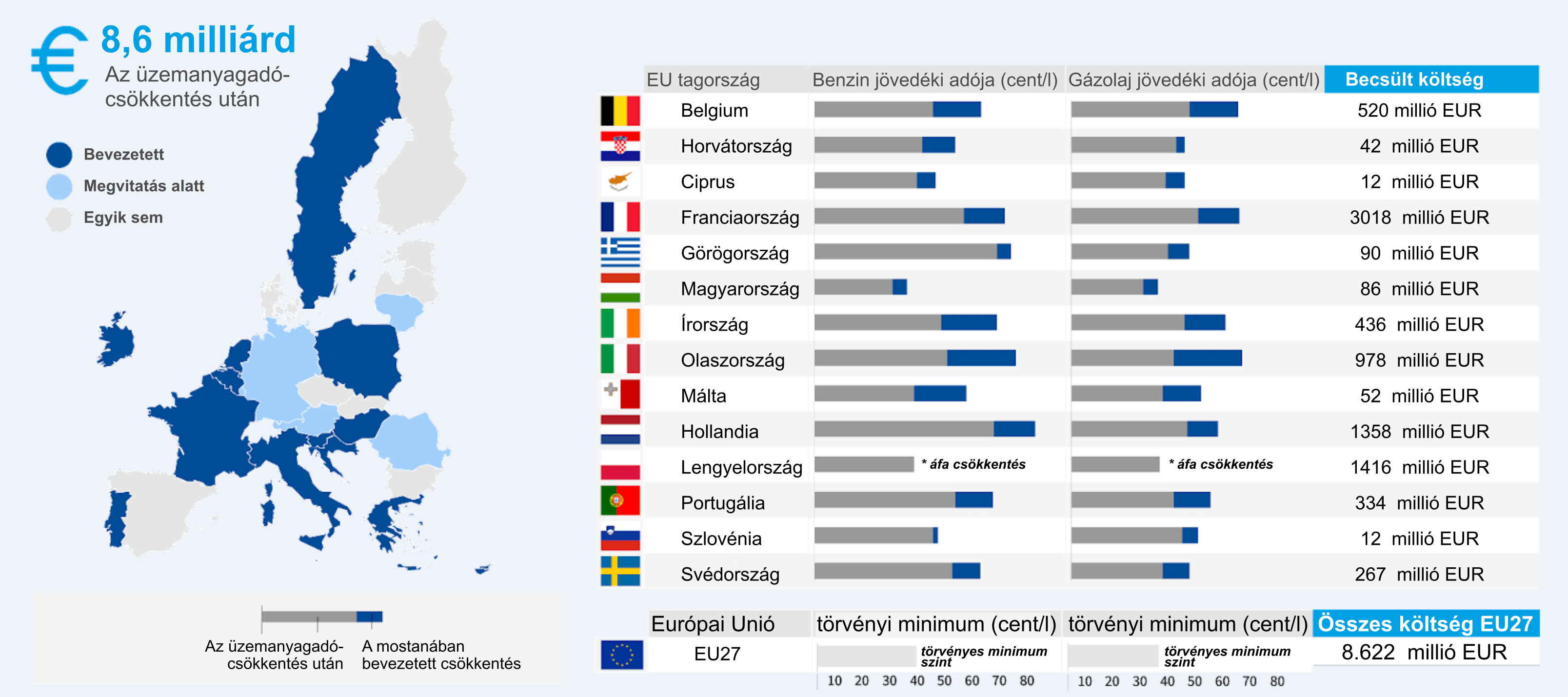 Csaknem 9 milliárd eurójába fog kerülni az európai adófizetőknek az – eddig 14 uniós tagországban bevezetett – üzemanyagadó-csökkentés. Ennek a közpénznek a túlnyomó részét a leggazdagabbak fogják kapni – a lakosság leggazdagabb 10 százaléka 8-szor többet, mint a legszegényebb 10 százaléka, derül ki az Európai Közlekedési és Környezetvédelmi Szövetség (T&E) mai napon nyilvánosságra hozott tanulmányából. Az üzemanyagadó csökkentése helyett az alacsony jövedelmű háztartásoknak nyújtott készpénztámogatásra lenne szükség.